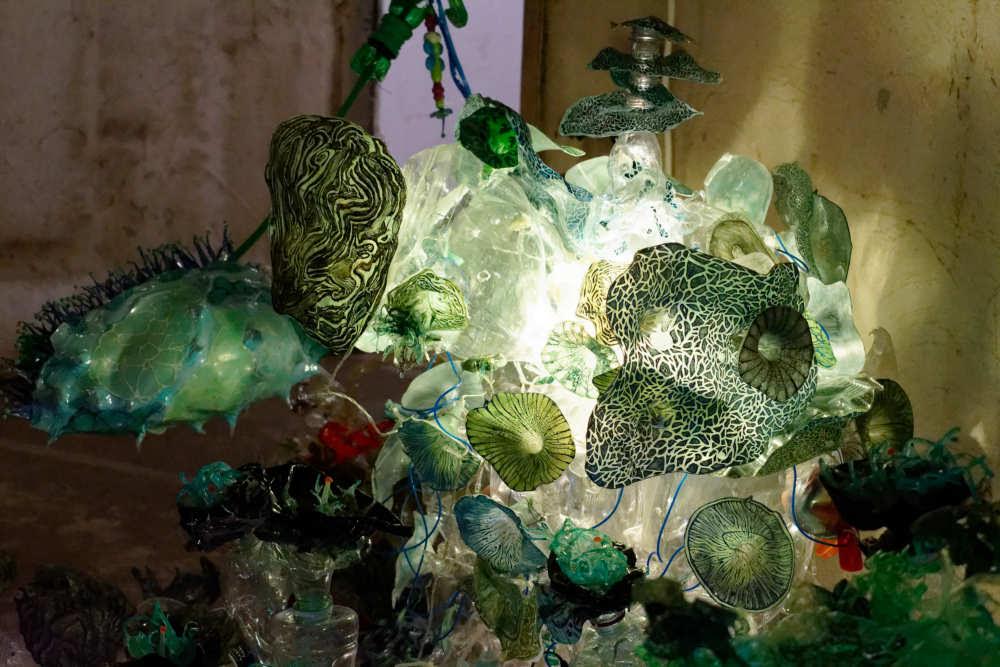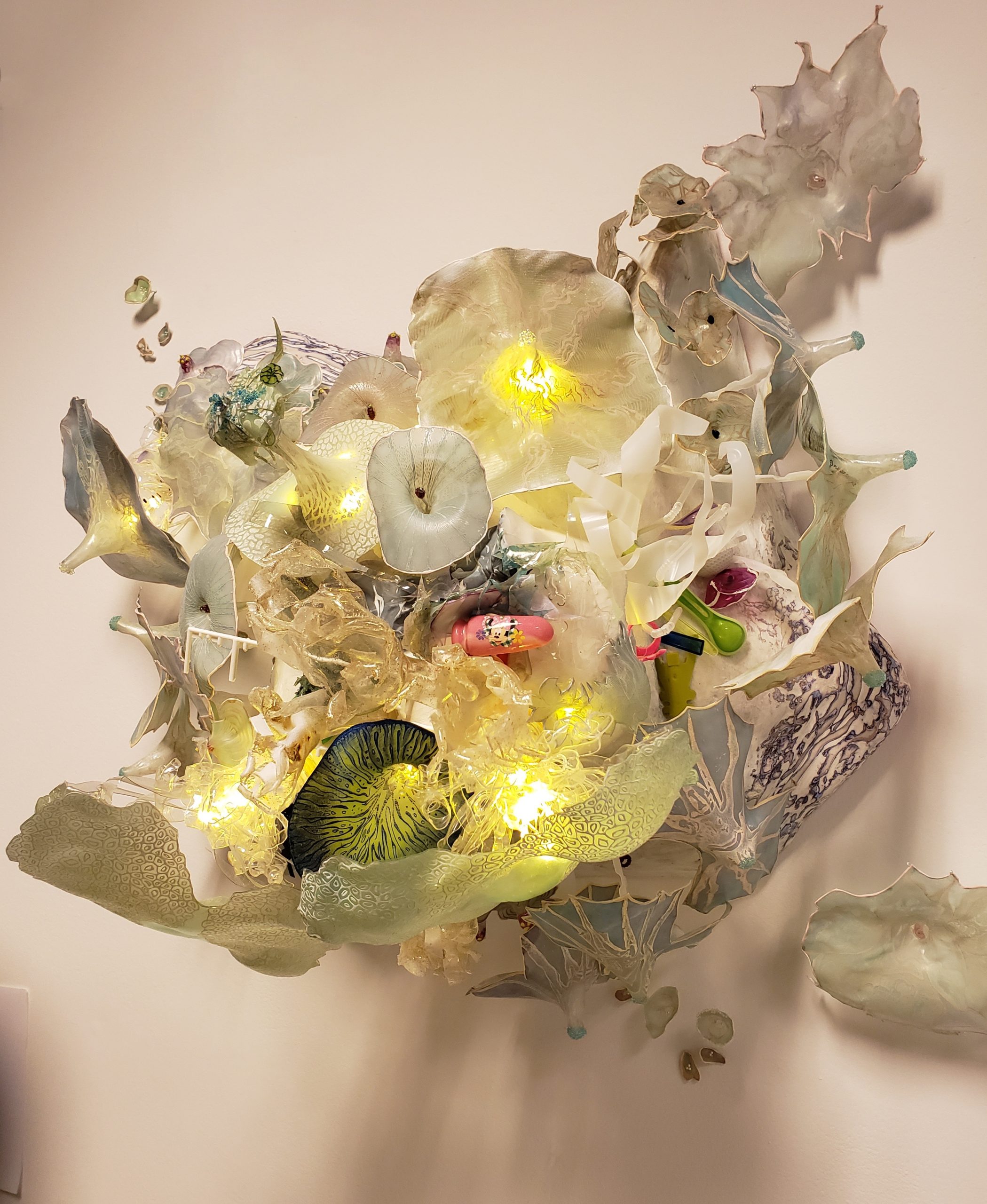 I have a theory that the tons of plastic trash being dumped into the oceans and other places, will become a resource for newly evolved life forms. Whether this will be helpful to humanity or not is where the monster comes in. My proposal is to fill the window at box 13 with an alternate world of evolutions that I have created from repurposed plastic and other mixed media. The glass window will become an aquarium for the creatures. The work is detailed, beautiful, and looks like glass yet also gives the viewer a deeper message to contemplate. Using Targel, I create prints cast from acrylic rather than printing on paper. These Targel prints are then attached to waste plastic that is sculpted to form the creatures. The Targel prints will just as easily attach to glass so in addition to the sculpted creatures, Targel prints can be “climbing” the glass of the window creating an additional creep factor. I am excited about the window space as it offers possibilities to display my work that I have not explored before.